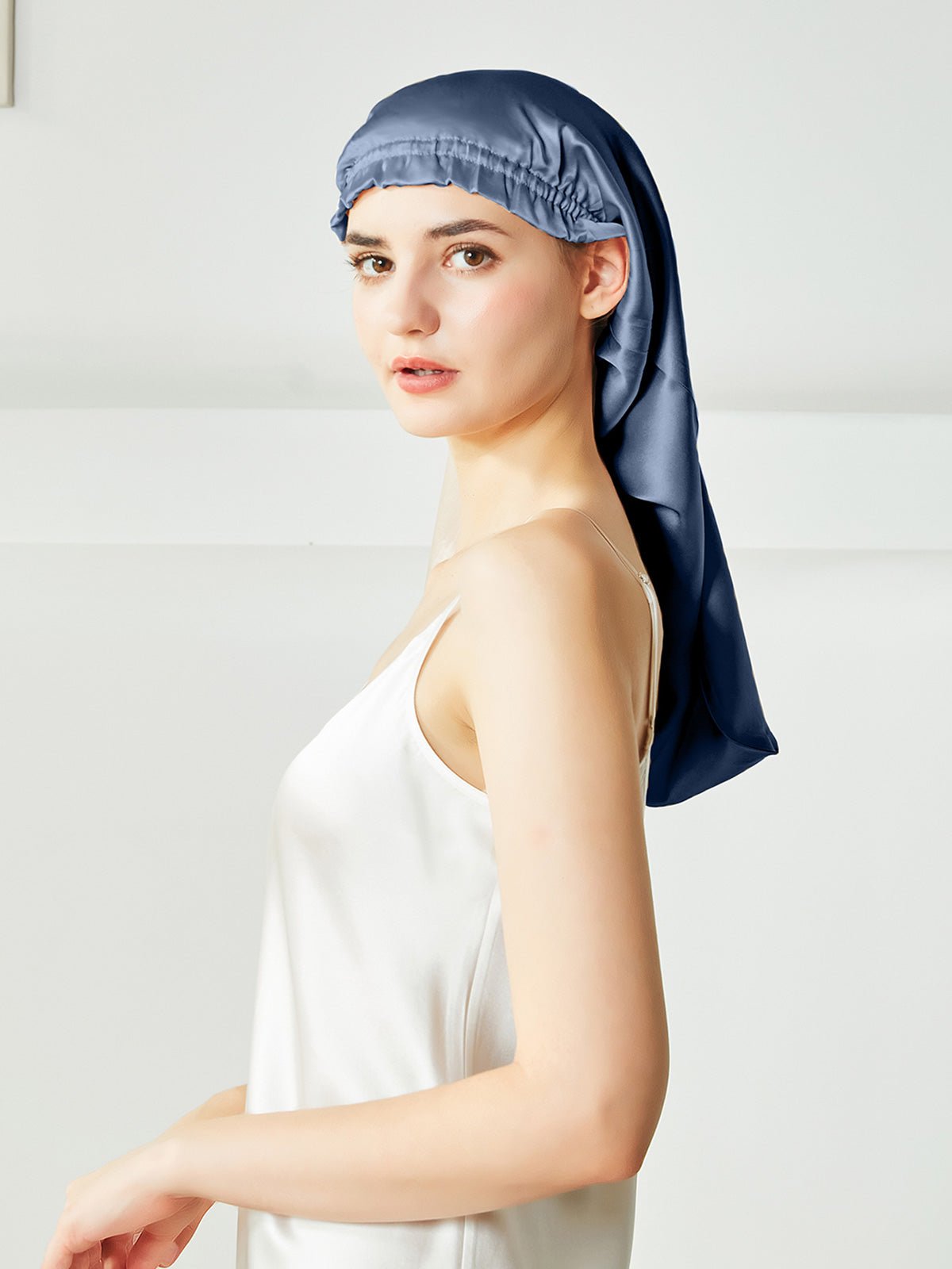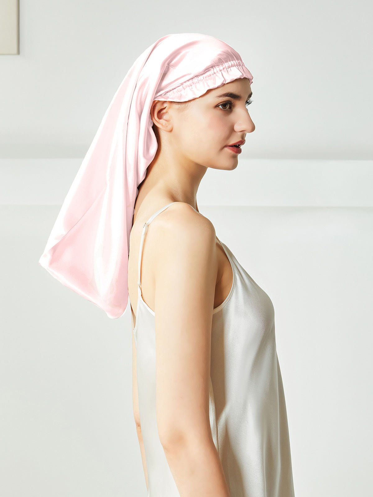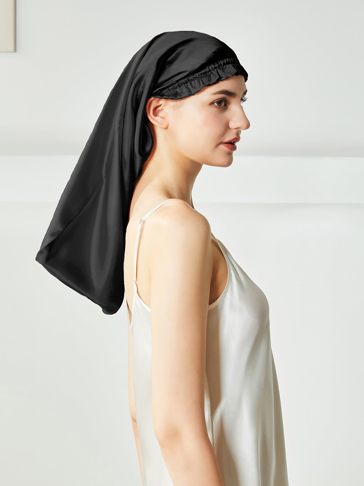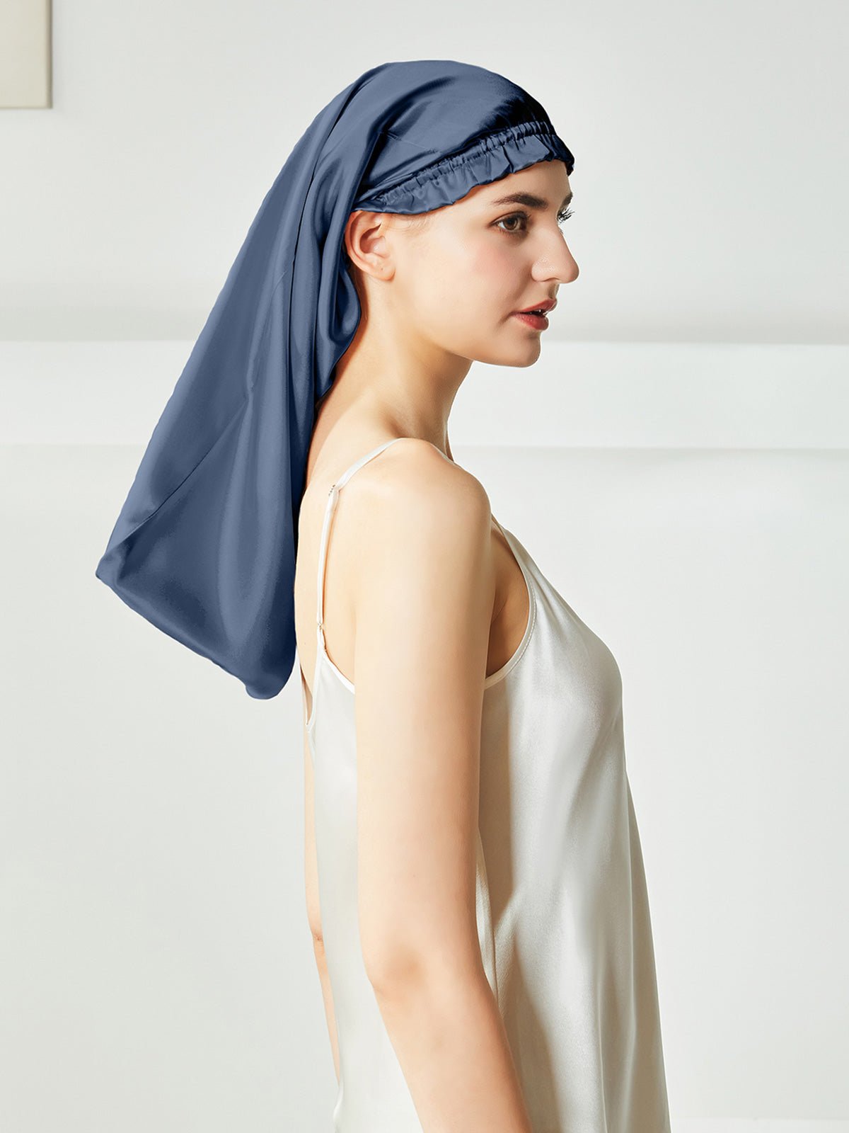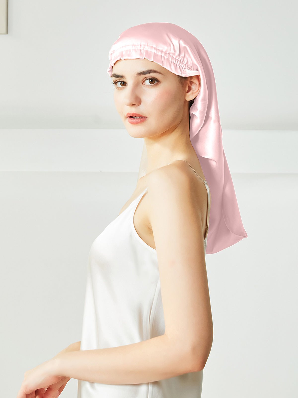 This is a long silk sleep bonnet. You can be put your long hair in the nightcap very relaxedly, instead of being folded on the head like the short nightcap, it can be easily worn on the head before going to bed. Silk can effectively keep the hair properly hydrated, not frizzy, and is beneficial for the hair.