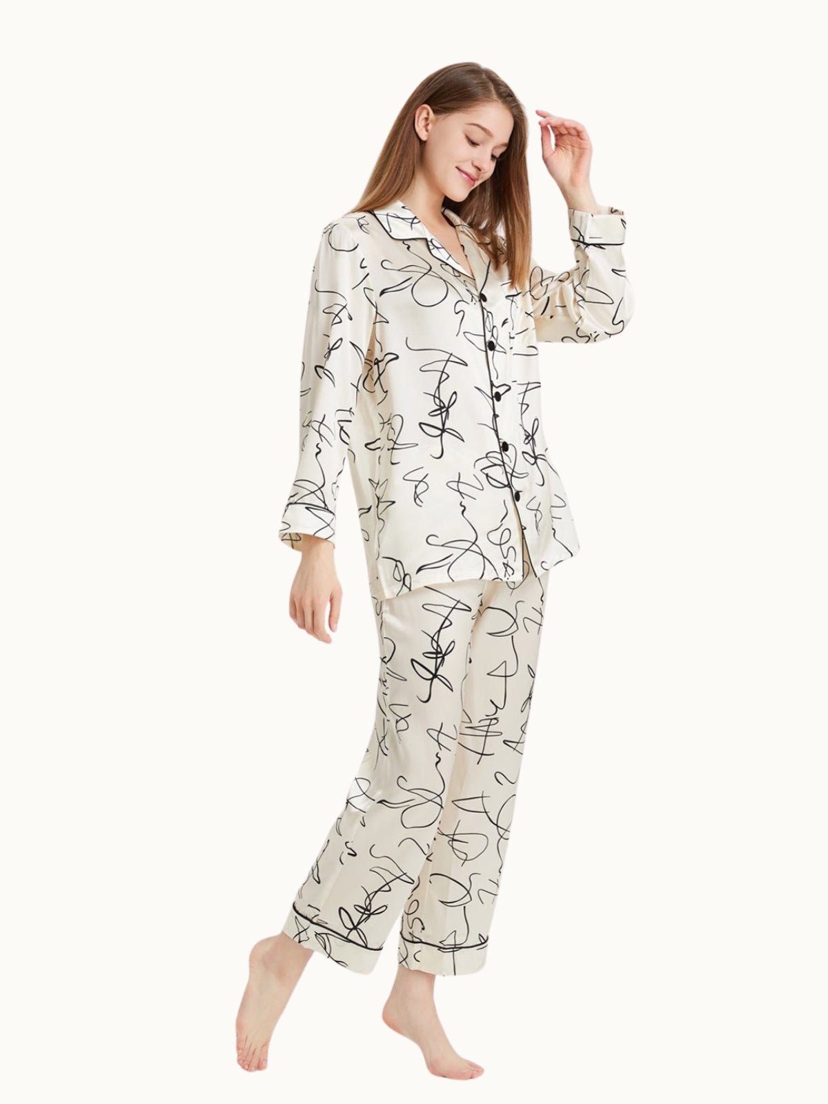 Luxurious women's v-neck silk pajama set made with 100% mulberry silk. Mulberry silk is the most luxurious type of silk and is sought after worldwide. Mulberry silk is known for its delicate and smooth texture and rich color. Mulberry silk fabric is also very durable, making it perfect for sleepwear, especially pajamas. The fabric is soft to the touch while being breathable, making it perfect for when relaxing at home or sleeping.