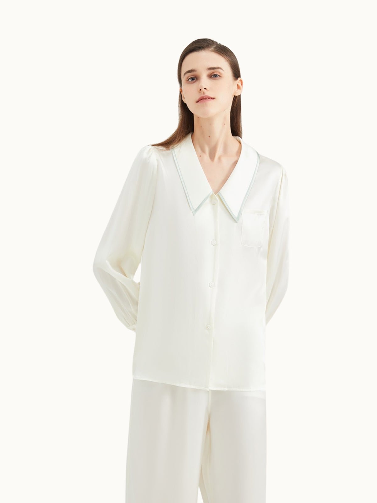 This luxurious women's v-neck silk pajama set made with 100% mulberry silk. Mulberry silk is the most luxurious type of silk and is sought after worldwide. Mulberry silk is known for its delicate and smooth texture and rich color. Mulberry silk fabric is also very durable, making it perfect for sleepwear, especially pajamas. The fabric is soft to the touch while being breathable, making it perfect for when relaxing at home or sleeping.