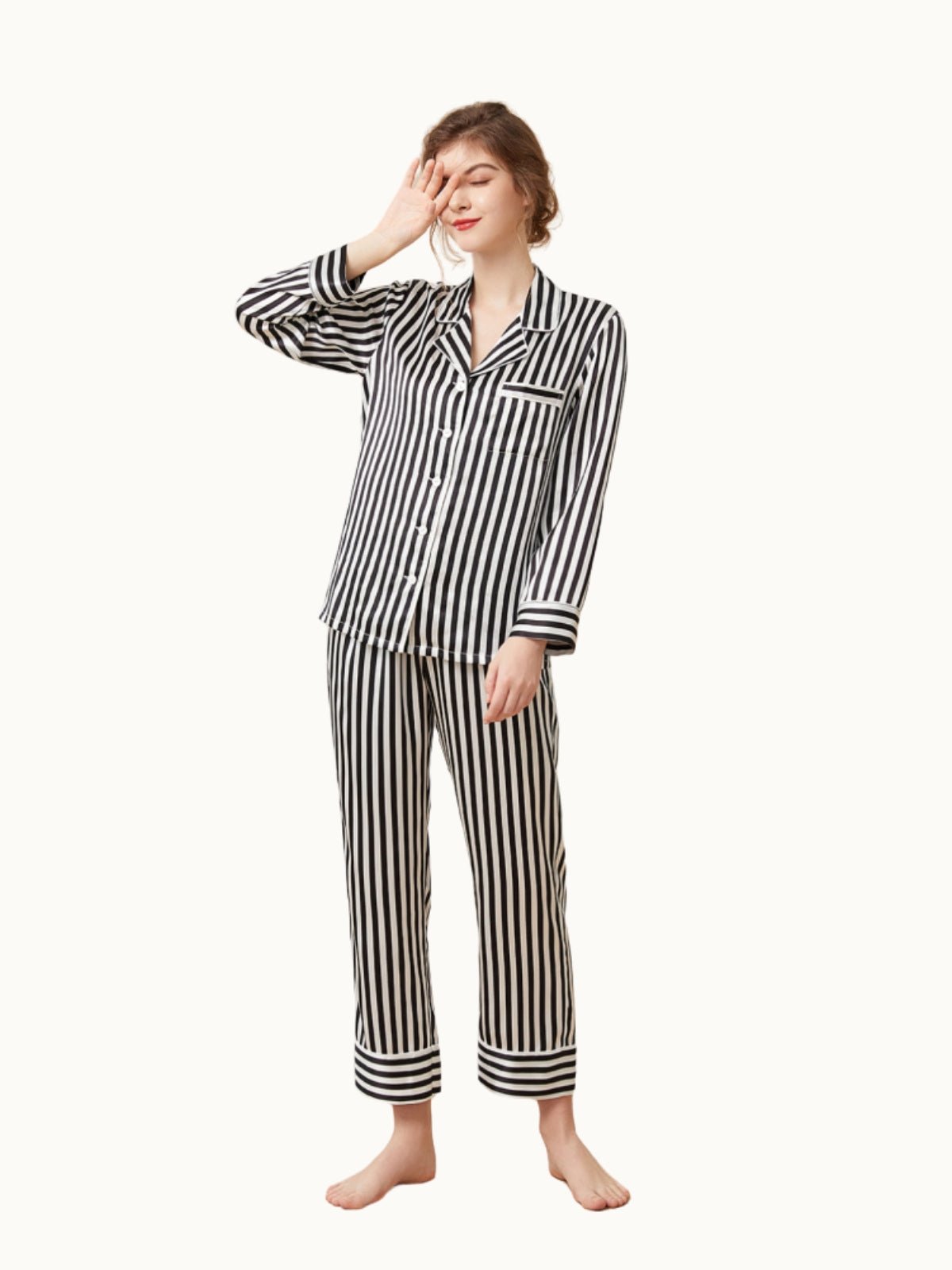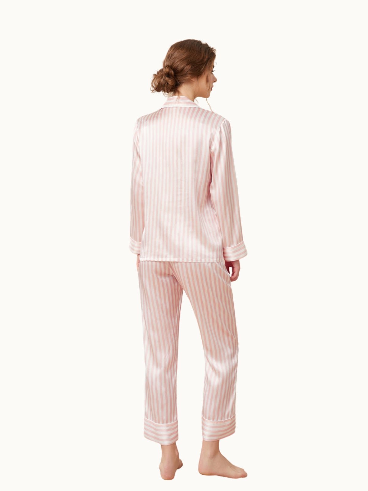 The first glance of this silk pajama set was attracted by its matching. It is rare to find a pink silk pajama set with stripes as an option. You can see all the tiny details on the clothes, and you are the brightest in it even at home, and the washable quality is one of its advantages, very easy to take care of!
