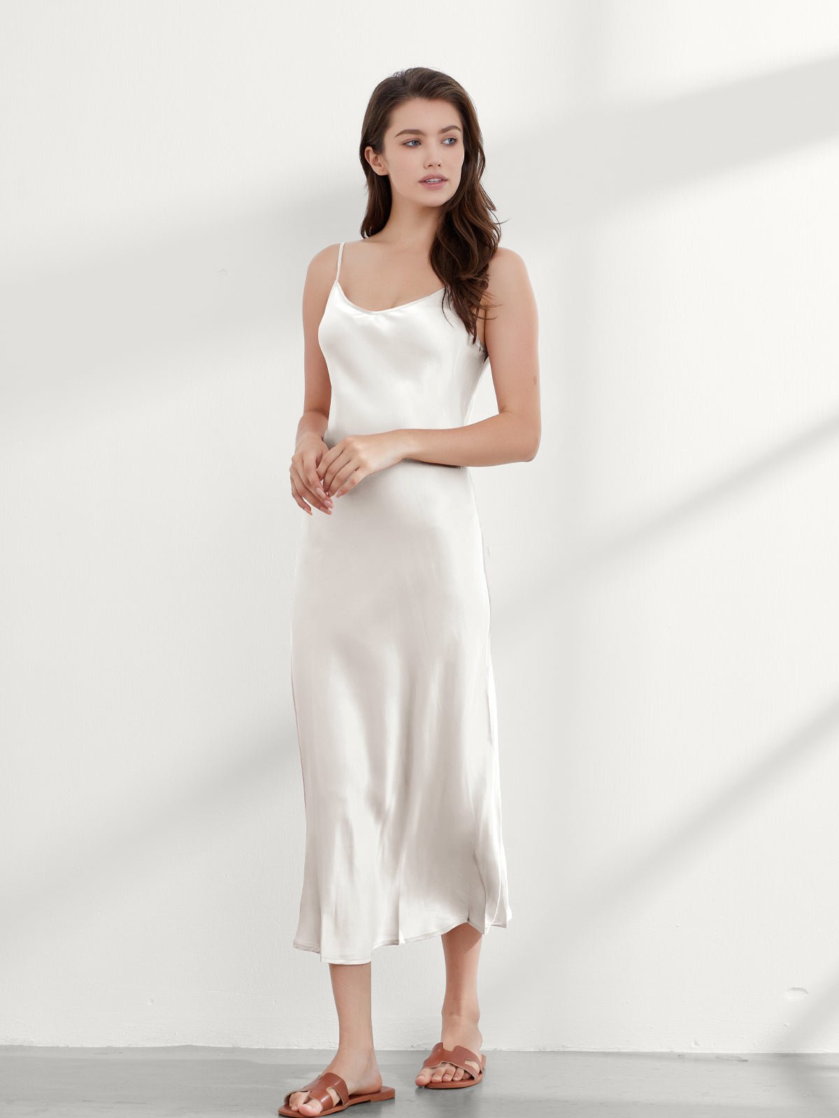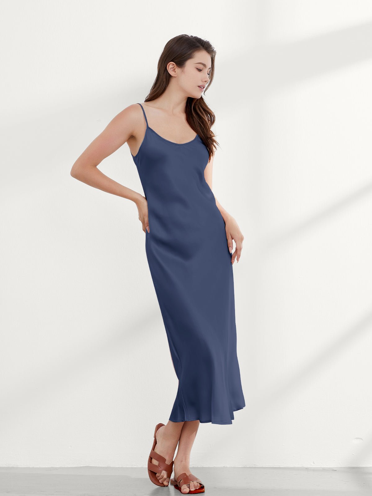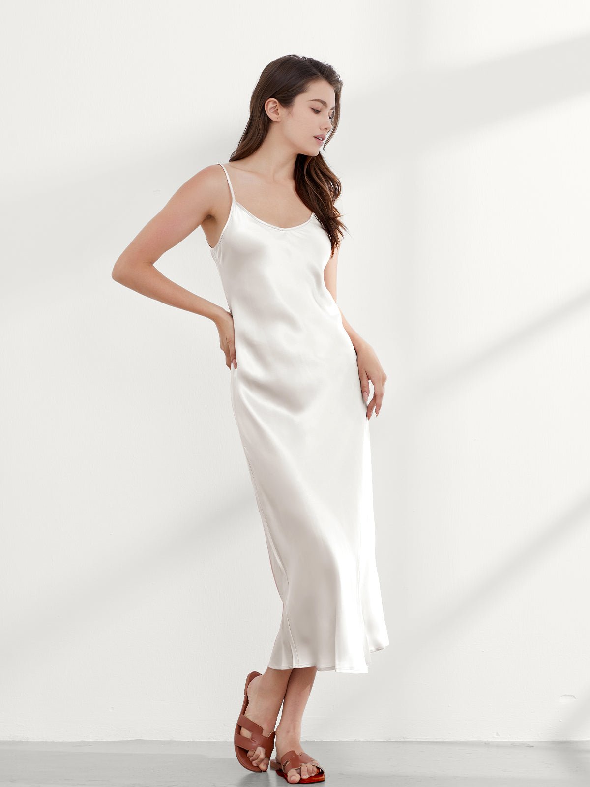 This ankle-length 100 mulberry silk nightgown long is cut on the bias for an incredibly slim fit, gorgeous drape, and adjustable shoulder straps. Add a shawl, or coat, or wear it alone, and you have the perfect evening look!