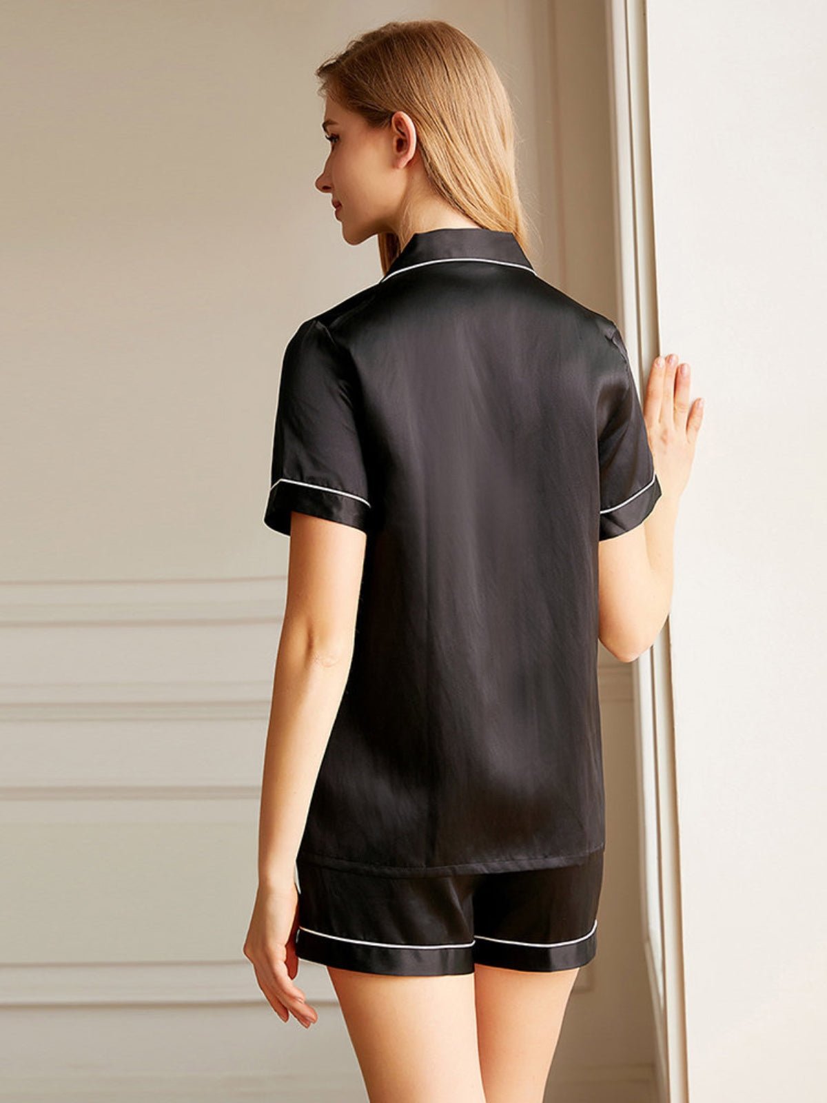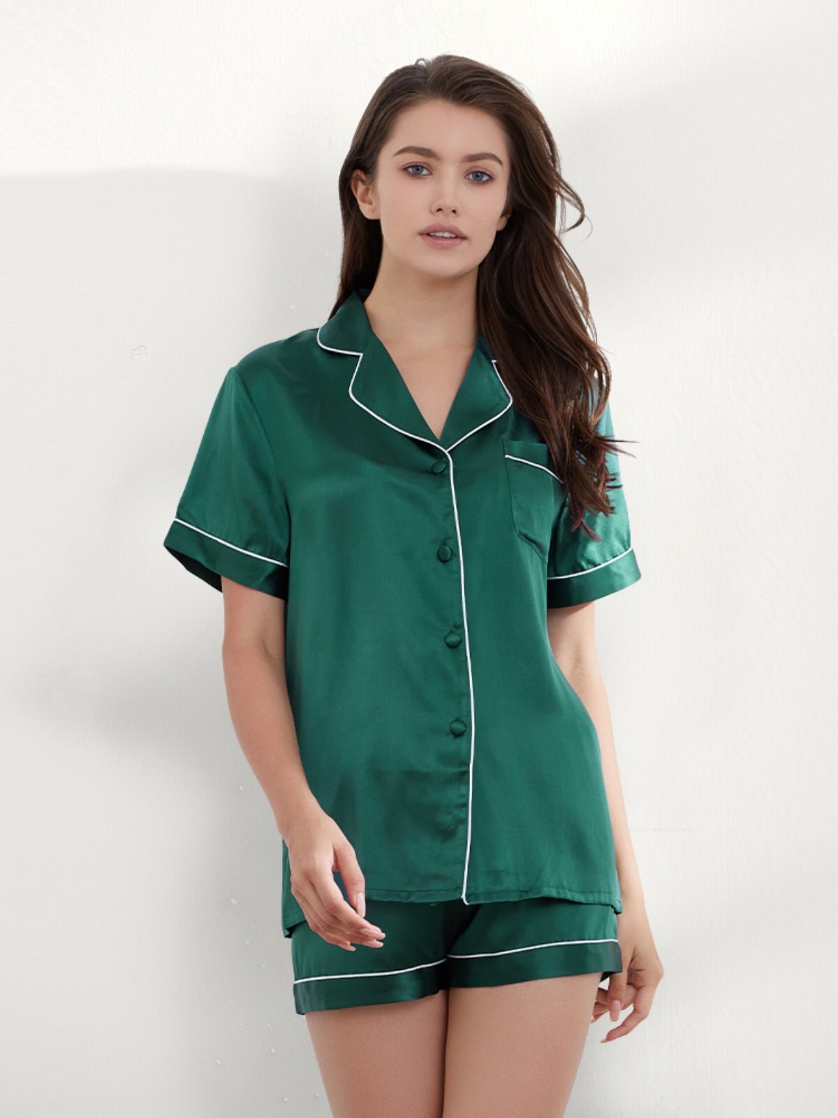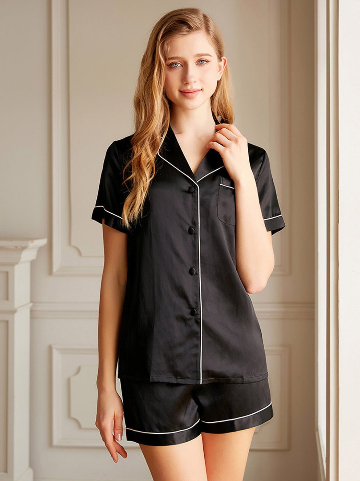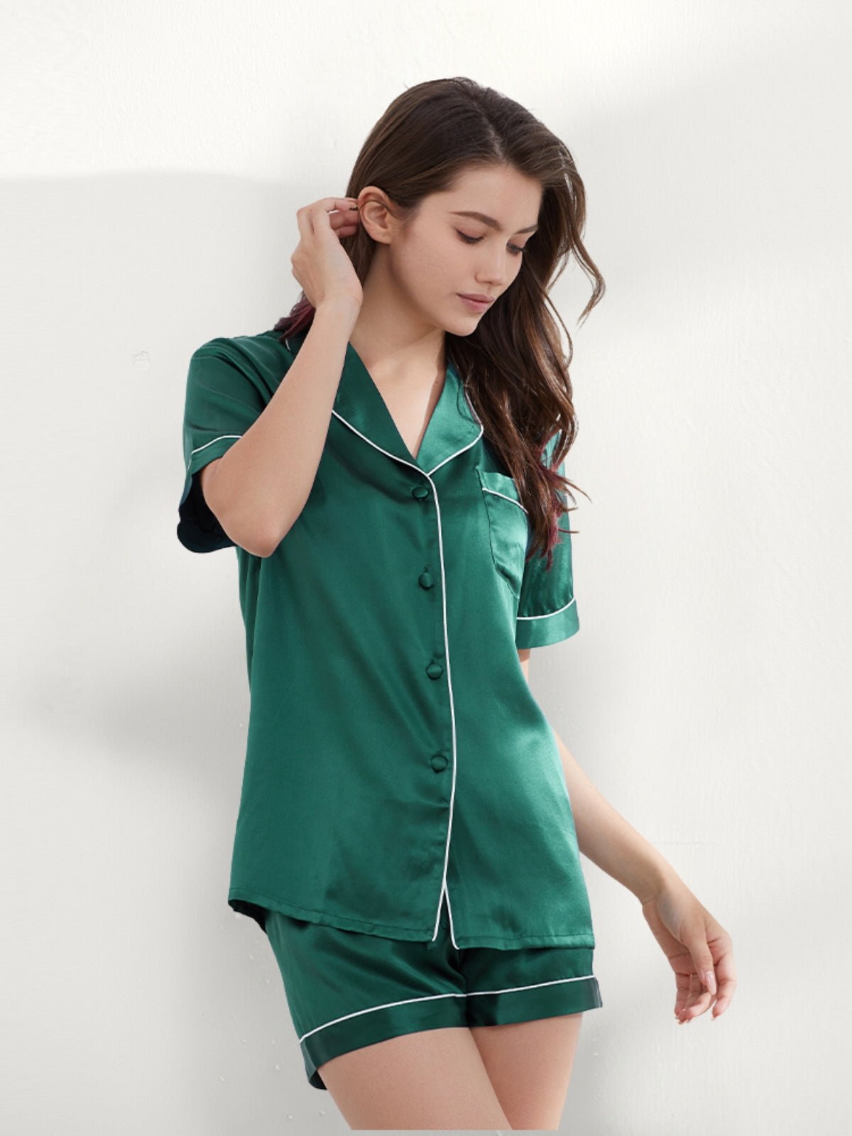 The luxurious texture makes you sleep enjoyable enough all night long. The beautiful colors and simple home style makes you fall in love with this short silk pajamas set. The short sleeves are also designed to regulate your body temperature. This silk pajamas set is designed for all women.