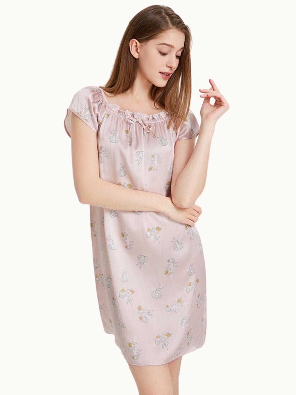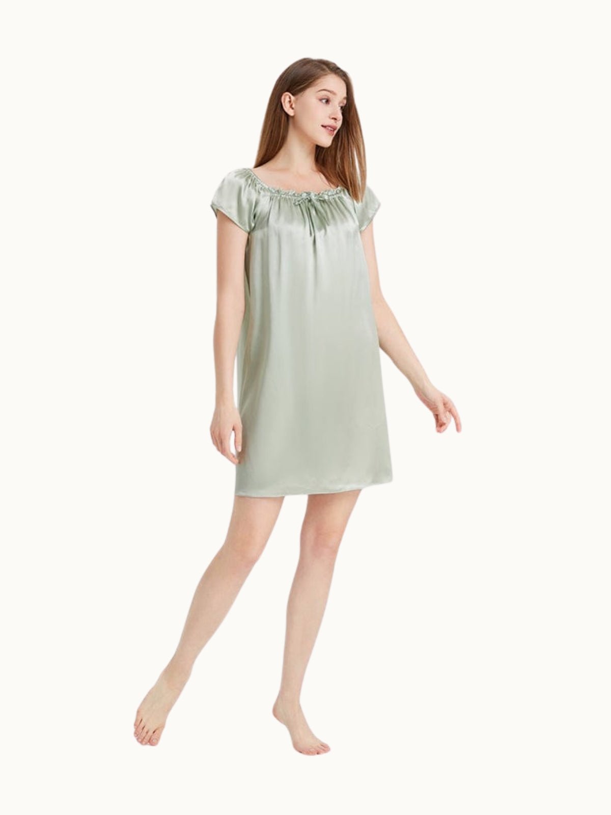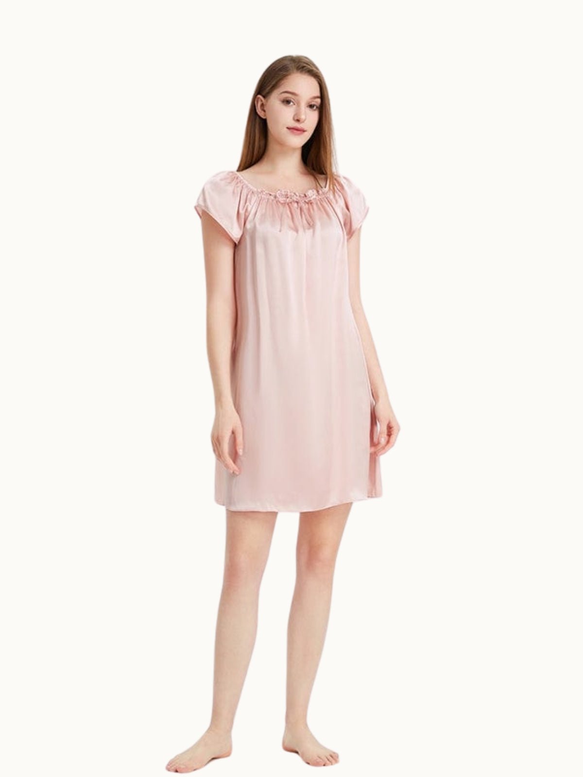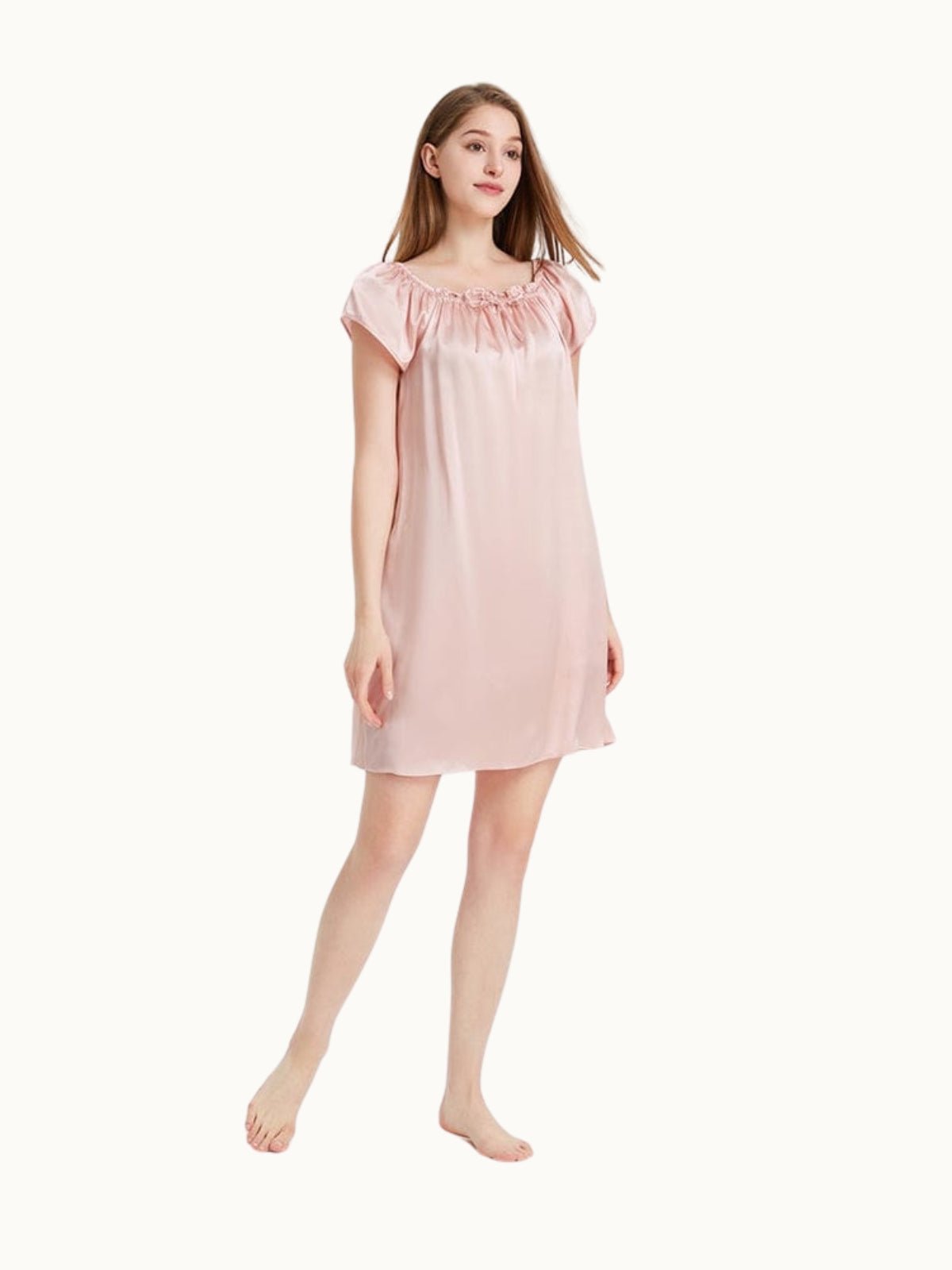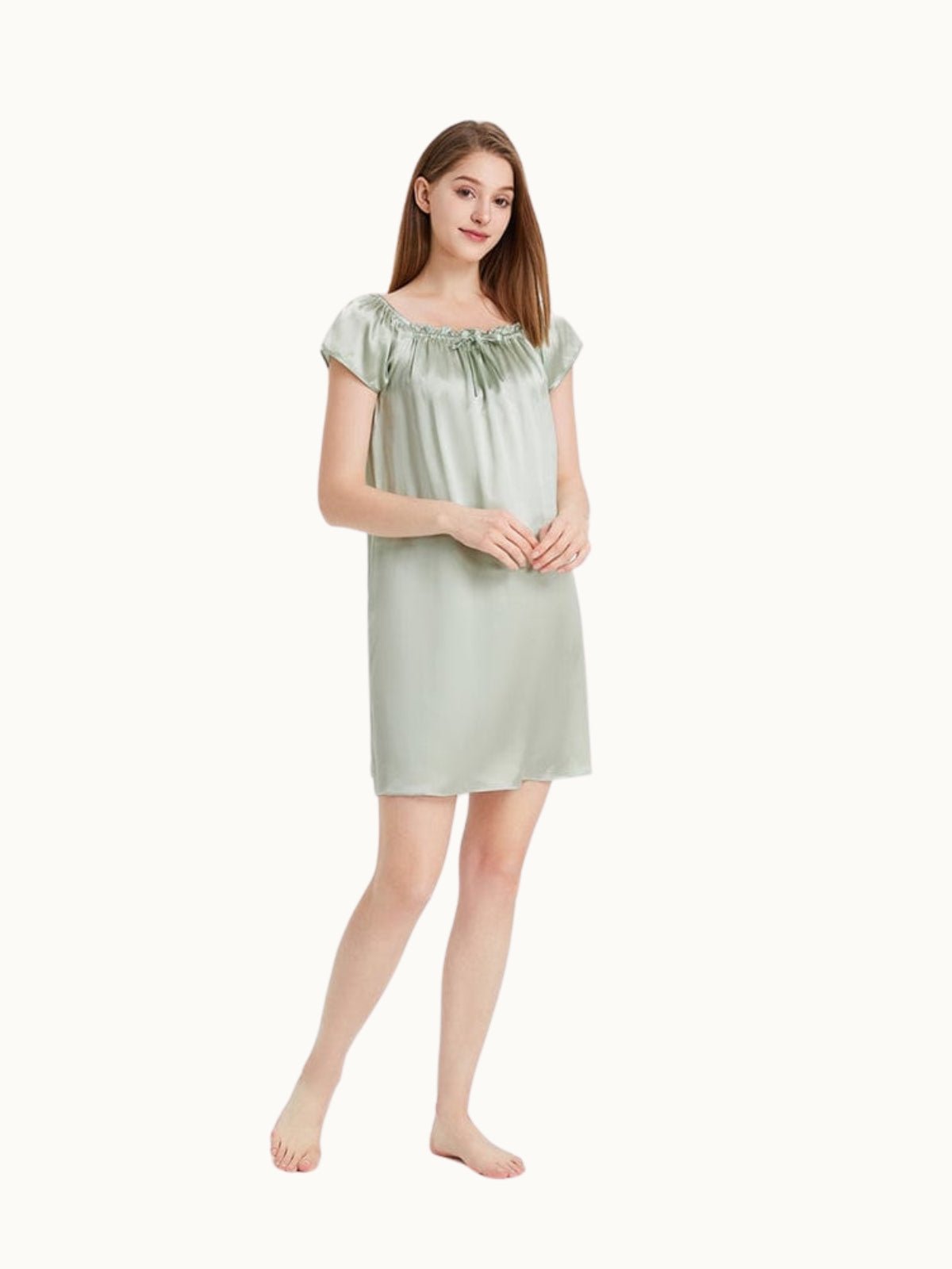 This 16 Momme Silk Short Sleeve Ruffle Silk Chemise is made of 100% Mulberry silk, which is washable. The simple yet modern design gives this 100 silk chemise a perfect silhouette. The washable silk chemise is the star line of THXSILK pajamas and includes a silk camisole top, short robe and pajamas sets. The ruffle design lets you have sweet style. It is a must-have for lounging at home.