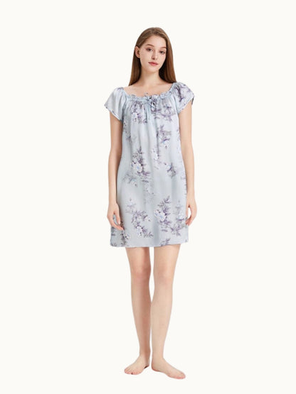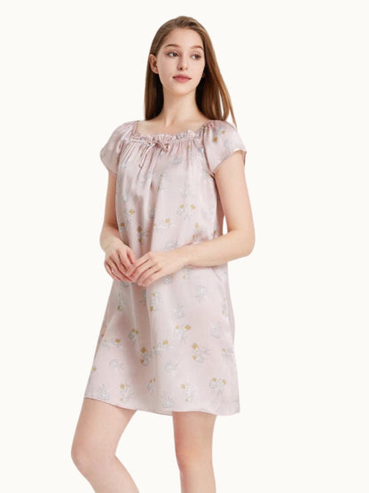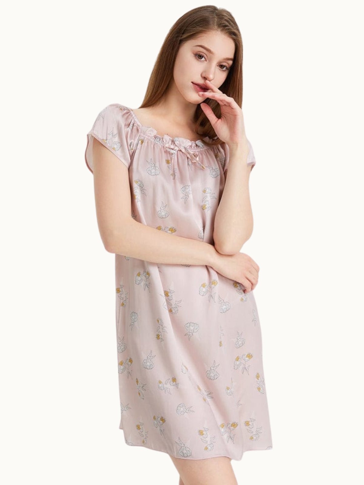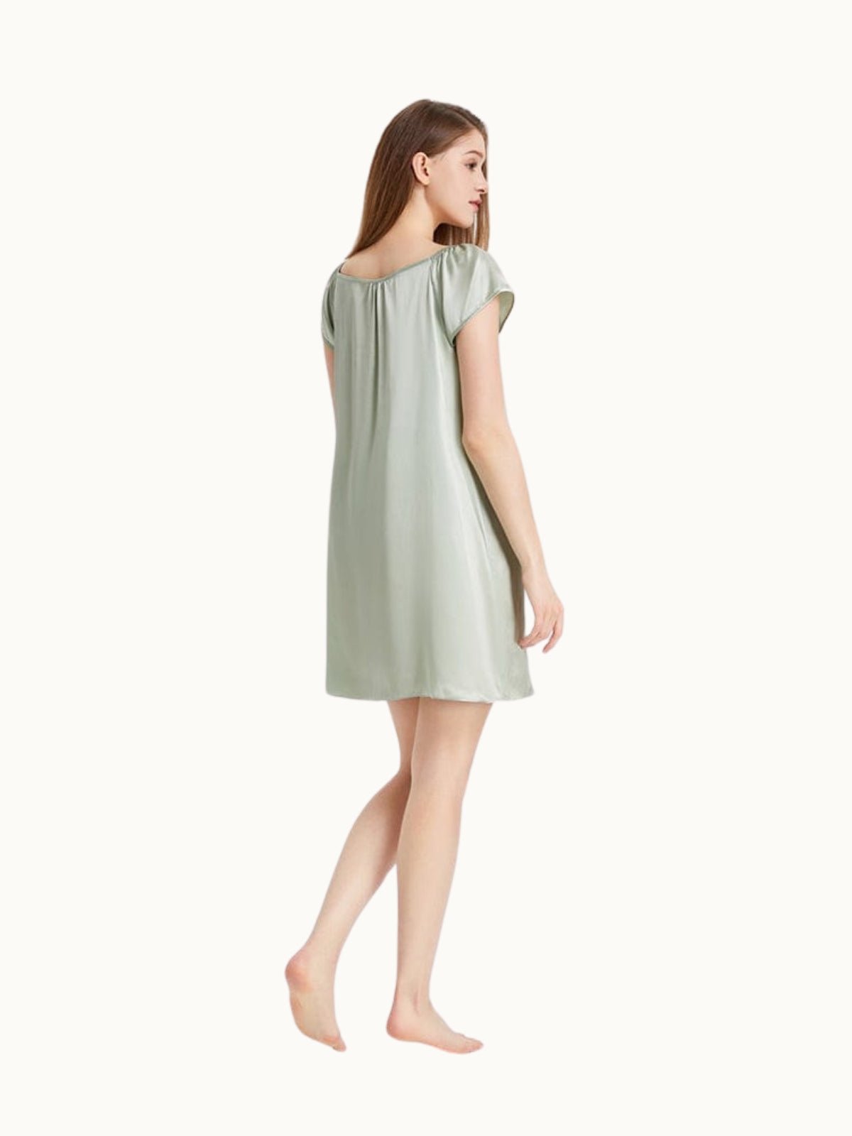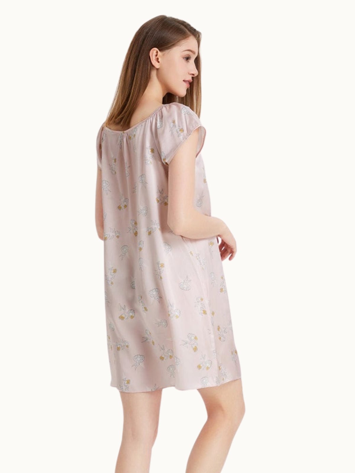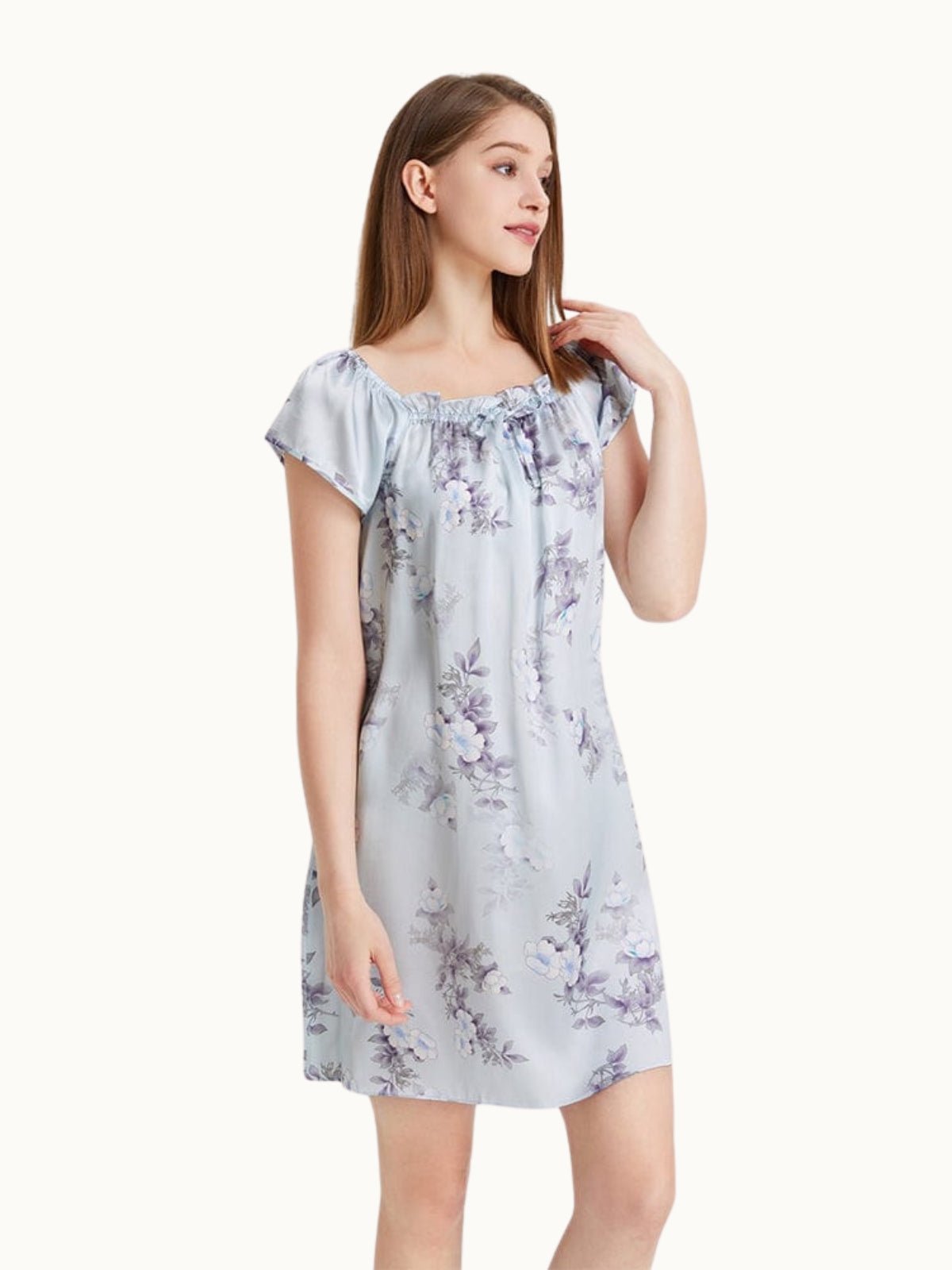 This 16 Momme Silk Short Sleeve Ruffle Silk Chemise is made of 100% Mulberry silk, which is washable. The simple yet modern design gives this 100 silk chemise a perfect silhouette. The washable silk chemise is the star line of THXSILK pajamas and includes a silk camisole top, short robe and pajamas sets. The ruffle design lets you have sweet style. It is a must-have for lounging at home.