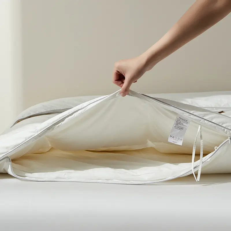 Silk is naturally fluid, so stability is key. Our duvet covers feature reinforced internal ties strategically placed at the corners and sides. These anchors allow your comforter and the silk cover to move as one, eliminating any shifting or bunching for a consistently smooth and flat sleep surface.