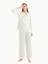 This luxurious women's v-neck silk pajama set made with 100% mulberry silk. Mulberry silk is the most luxurious type of silk and is sought after worldwide. Mulberry silk is known for its delicate and smooth texture and rich color. Mulberry silk fabric is also very durable, making it perfect for sleepwear, especially pajamas. The fabric is soft to the touch while being breathable, making it perfect for when relaxing at home or sleeping.